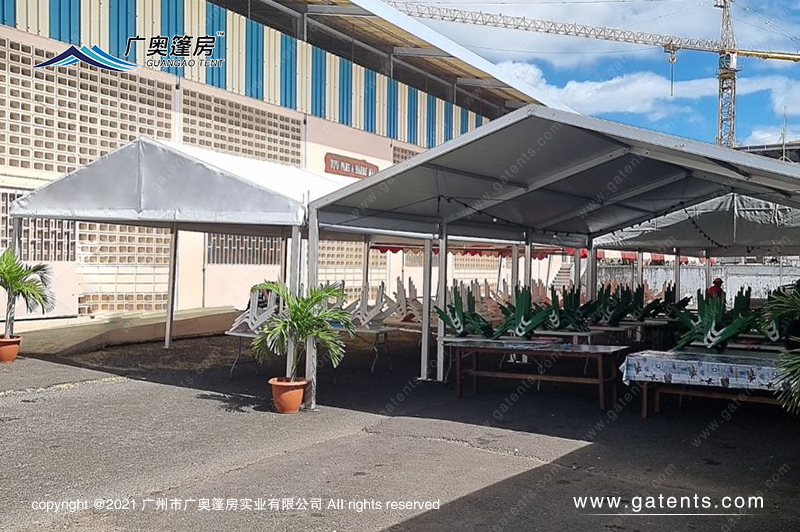 外國喜歡戶外餐飲形式,戶外篷房能解決各種戶外餐飲臨時建筑或者是永久性建筑需求,打破傳統(tǒng)封閉式的建筑餐廳,我們廣奧在法屬完成的案例中,應(yīng)用戶要求設(shè)計兩頂人字形篷房,篷房跨度15米,面積大約在200米左右,無圍布,呈現(xiàn)出寬敞無邊的餐廳活動空間,可以避風(fēng)避雨,容納很多人,甚至可以分配成不同區(qū)域用餐空間。達(dá)到滿意的空間分配需求。
